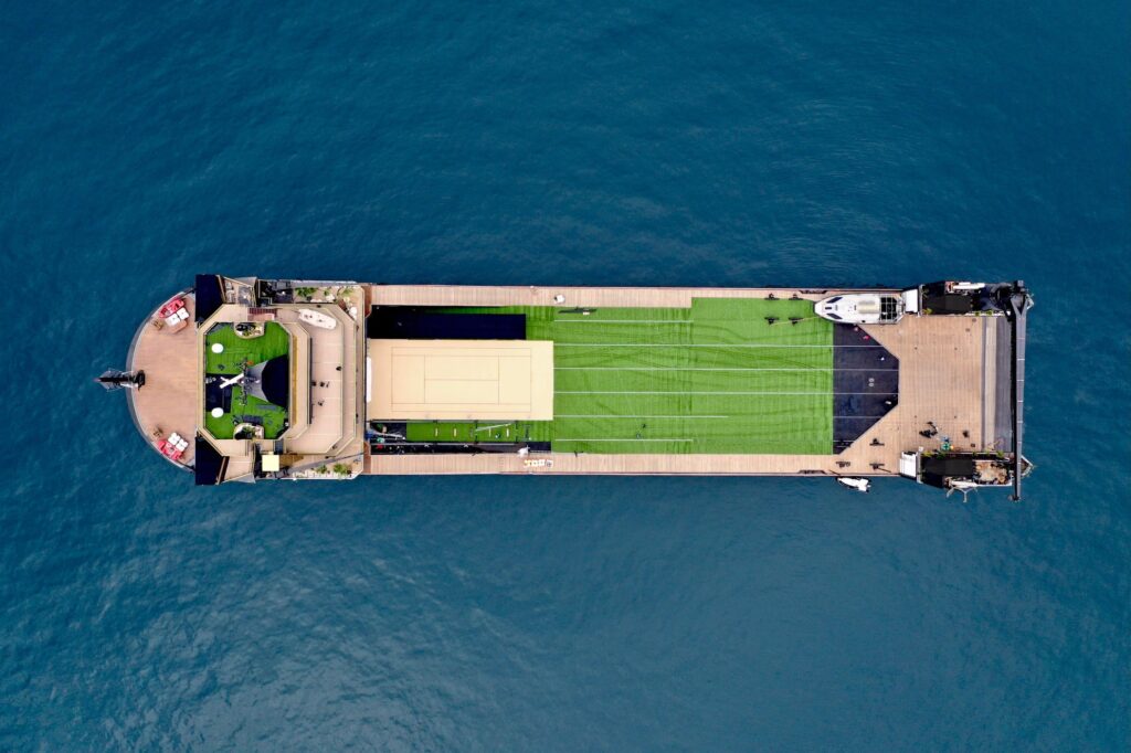 A semi-submersible former support vessel has been converted by Karmarine Shipyard into an unusual expedition yacht, with a grass tennis court and enough room to carry 70 luxury toys, a 46m sailing yacht and a sea plane.