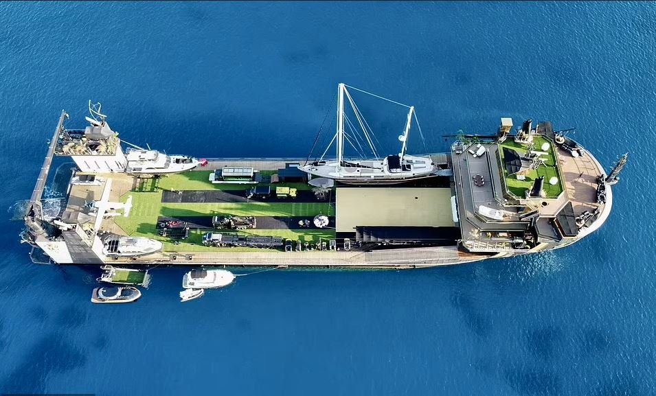 The yacht has a sun deck jacuzzi, swimming pool surrounded by glass windows, outdoor cinema, botanic garden, four aquariums and enough room for 20 guests. OK also has a large car ramp, a 40-tonne crane and a vertical wind turbine.